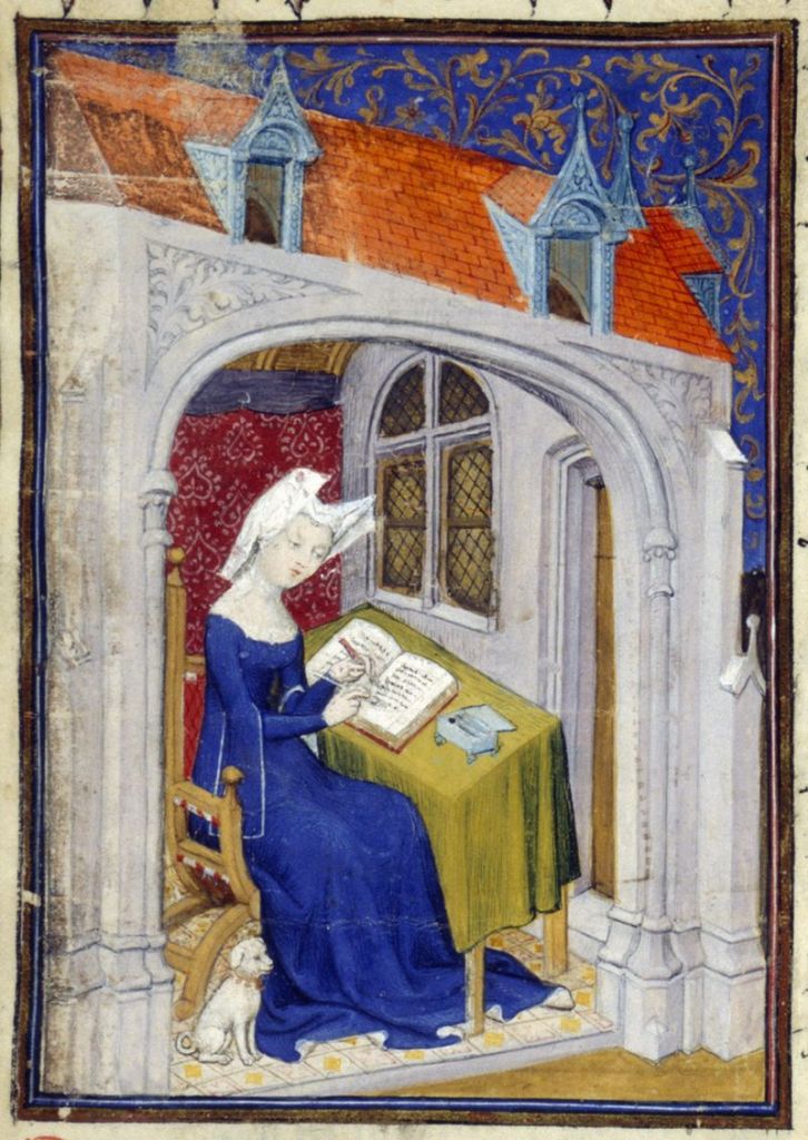 Detalle de una miniatura de Christine de Pizan (1364- c. 1430) reconocida como una de las primeras escritoras profesionales de la historia occidental, trabajando en su estudio, acompañada de su lomito chiquito. ‘Cent balades’, Book of the Queen, France (Paris), c. 1410 – c. 1414, Harley MS 4431, f. 4r